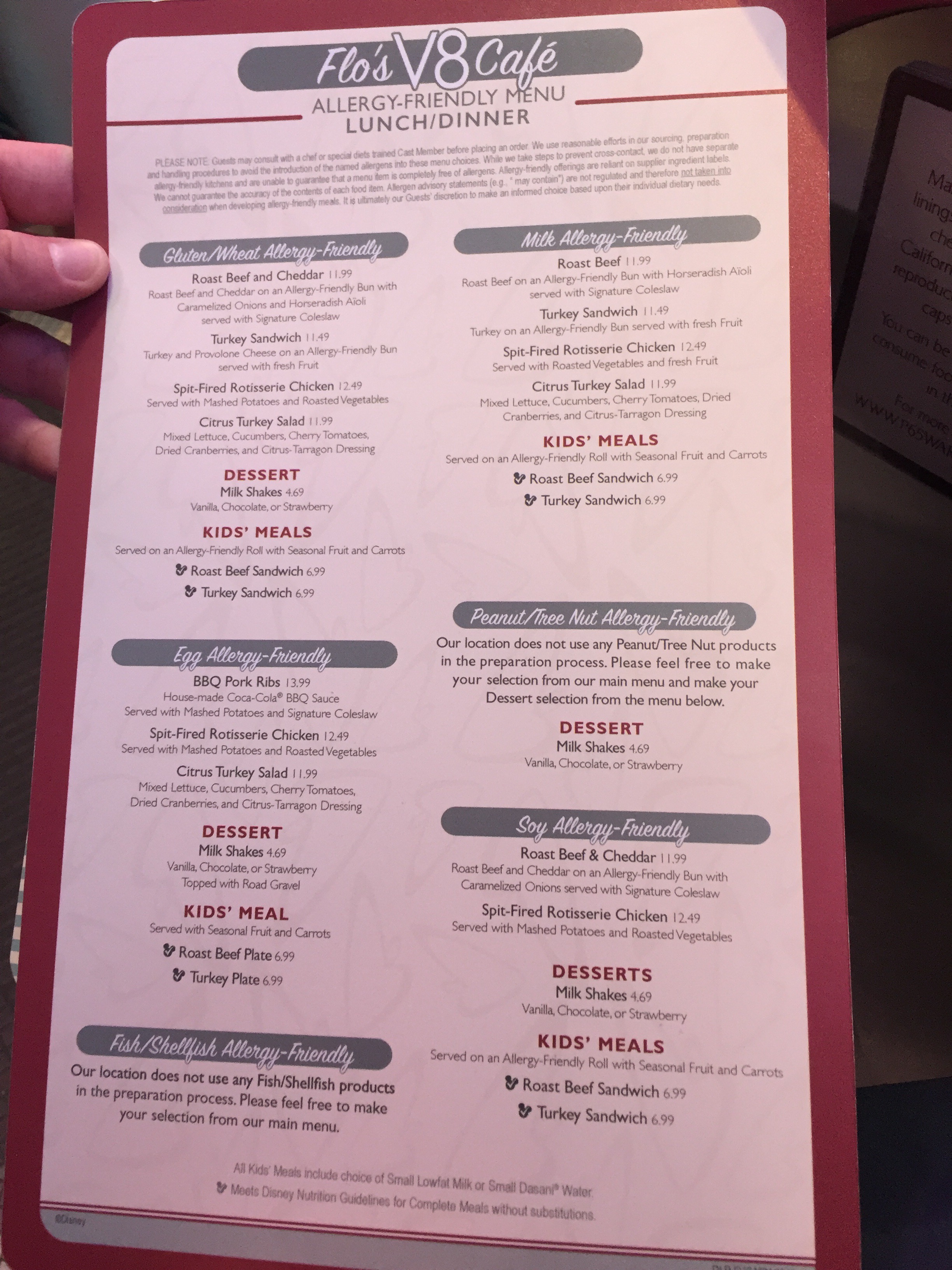 Located in Carsland in Disney’s California Advenutre I love the themeing of this restaurant. This time I remembered to take a picture of the menu. The top left hand corner is the area for us gluten free people. This was another fun stop for everyone.