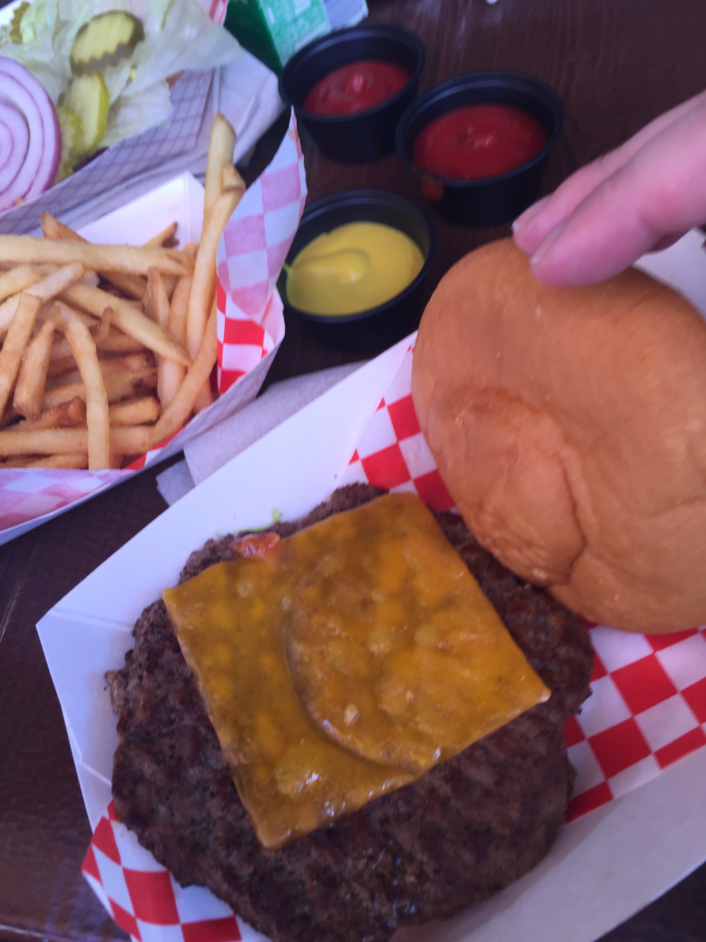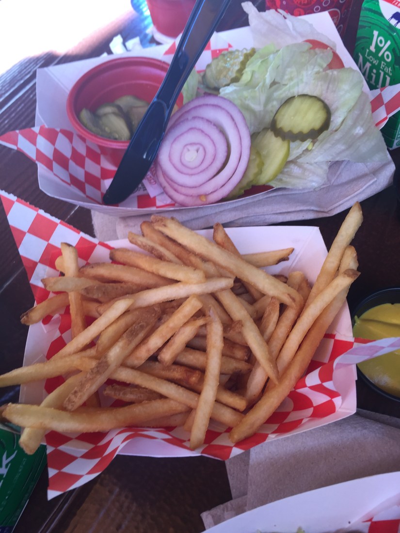 Located next to Soarin’ in Disney’s California Adventure theme park we usually stop here at least once a trip. For everyone else here there is a burger fixings bar where you grab and add any condiments or garnishments you may want. For me I asked and they graciously grabbed some from the back that hadn’t been out for the “gluten eaters”. Also the fries are gluten free- yumm!